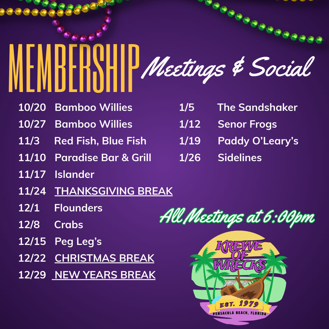 Come together with fellow members every week to stay updated on Krewe details and support our amazing island businesses. These gatherings are a great way to connect, share ideas, and celebrate the vibrant spirit of Pensacola Beach. We can’t wait to see you there!