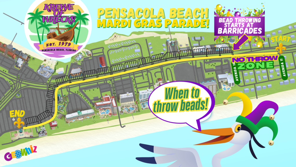 - The parade route starts near Avenida 11, proceeding west on Via de Luna and into the entrance lanes of Casino Beach parking lot, ending at the Pavilion (GSP). No throws should be tossed after passing the signs designating the end of parade route regardless of spectators.